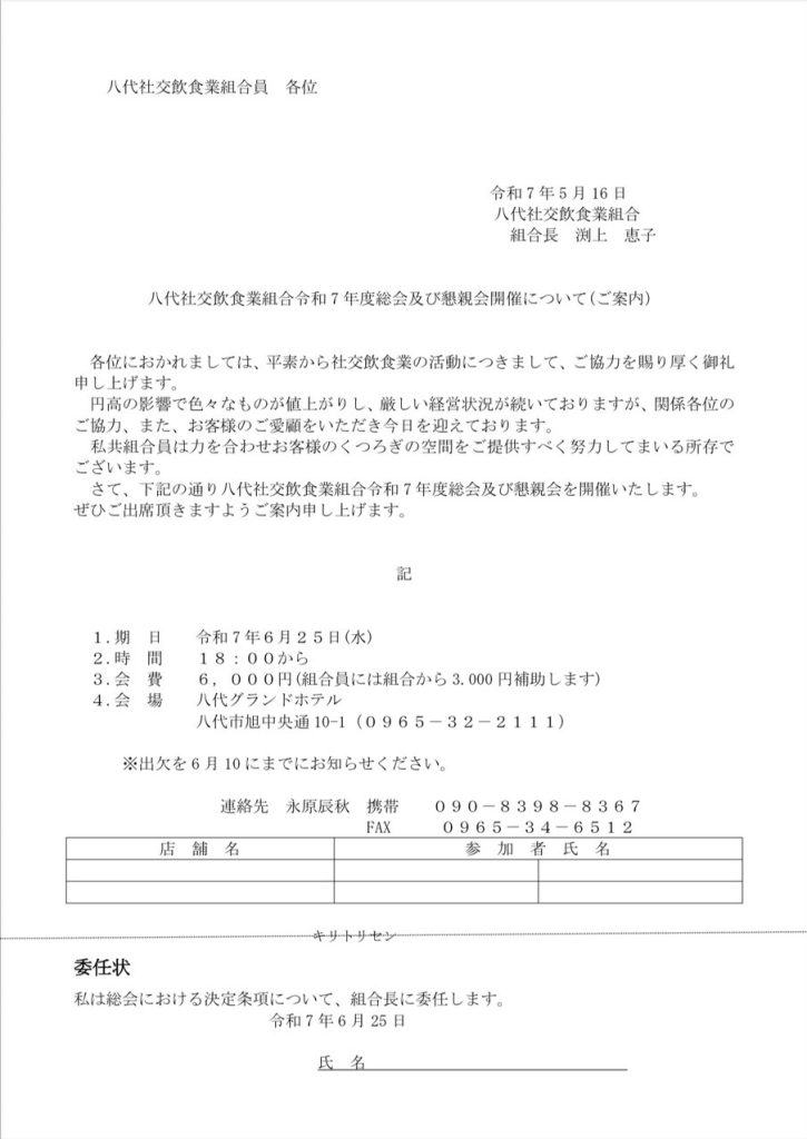 八代社交飲食業組合令和7年度総会及び懇親会開催について(ご案内)